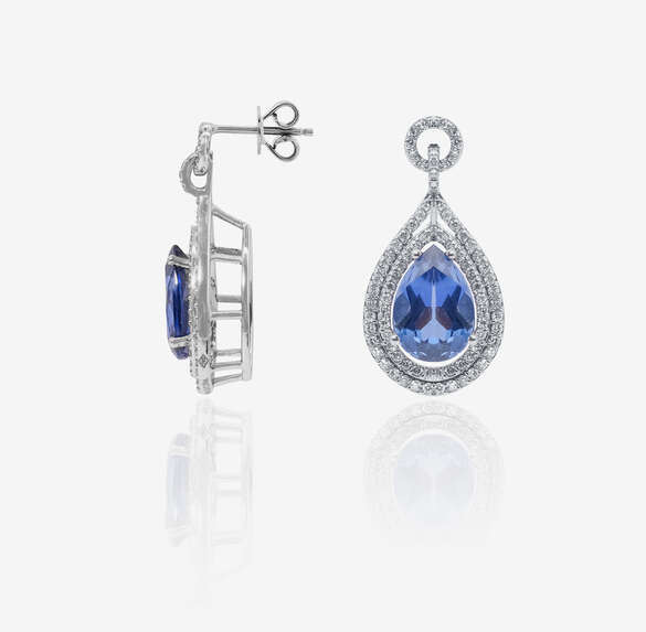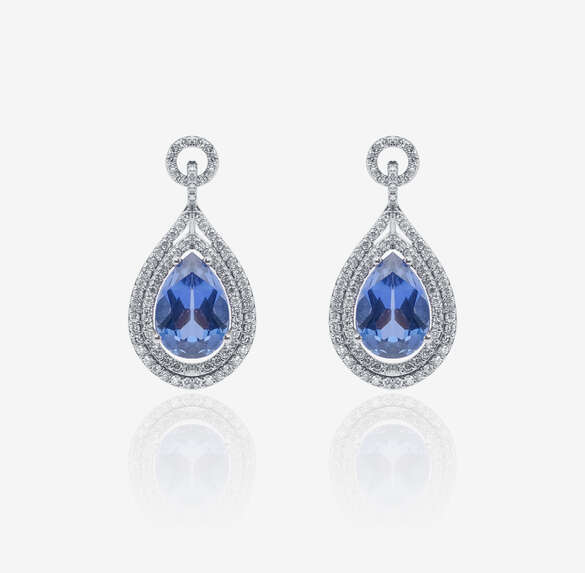 Pırlanta ve damla kesim safir taşlı 18 ayar beyaz altın küpe