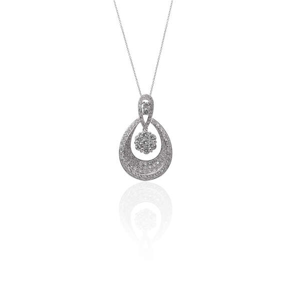 Armut biçimli beyaz  renkteki yuvarlak parlak pırlantalarla kaplı 18k beyaz altın kolye. 16 inçlik bir zincir ucunda yer alan kolye ayarlanabilir zinciri sayesinde ister uzun ister daha kısa kullanılabilir.