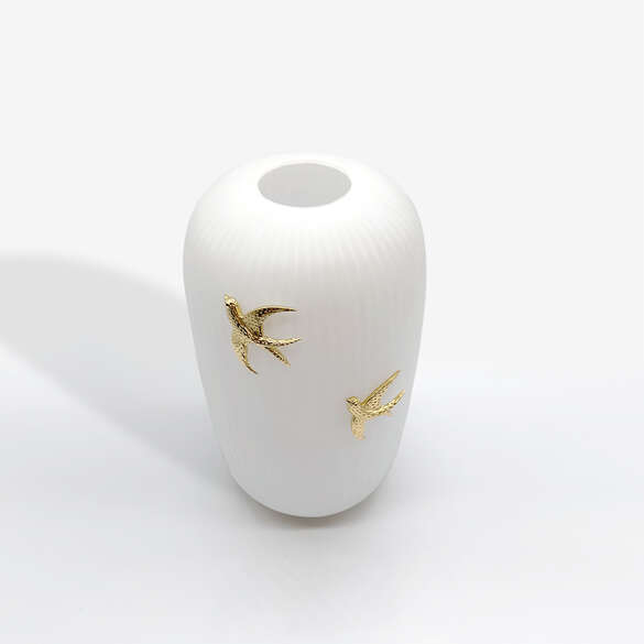 Mat beyaz cam üzerine altın kaplamalı kırlangıç kuşları gözeri yakut detaylı dekoratif vazo