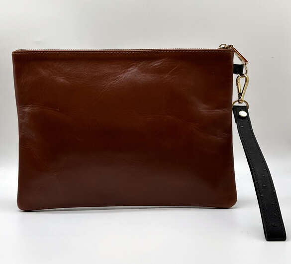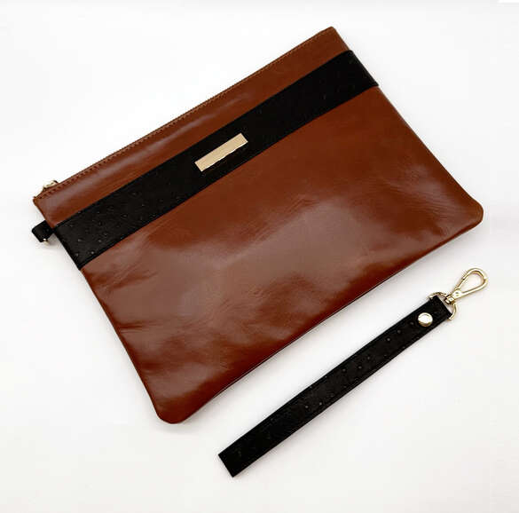 Karun Leather customizable clutch with brown and black leather, gold-colored accessories