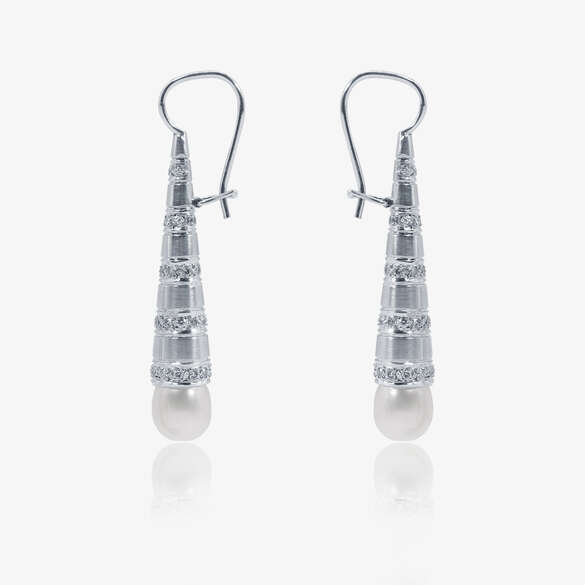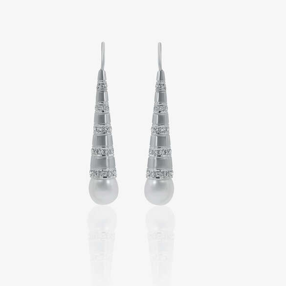 Güney okyanus incileri ve yüksek kalite beyaz pırlantalarla çevrili küpeler, günlük hayatta  en çok tercih edilen beyaz altından üretildi. Tasarımda özel bir teknikle matlatştırılan beyaz altın modern ve yalınlığı simgeler. Karun İncili küpe tek başına çarpıcı durduğu kadar çok yönlü diğer Karun takılarıyla da bütünlük sağlar.