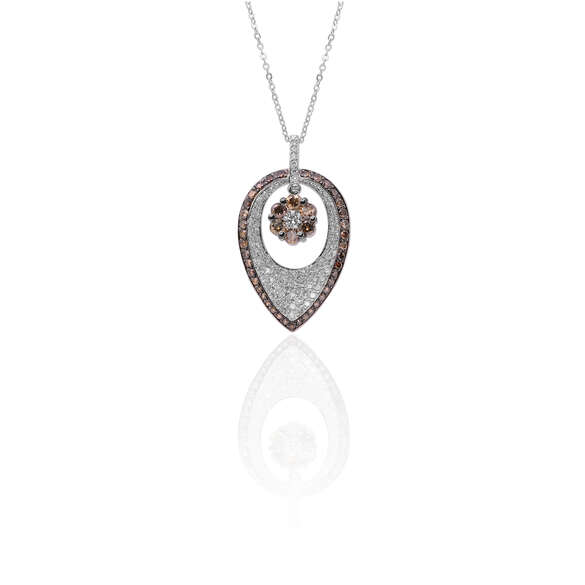 Armut biçimli konyak ve beyaz  renkteki yuvarlak parlak pırlantalarla kaplı 18k beyaz altın kolye. 16 inçlik bir zincir ucunda yer alan kolye ayarlanabilir zinciri sayesinde ister uzun ister daha kısa kullanılabilir.