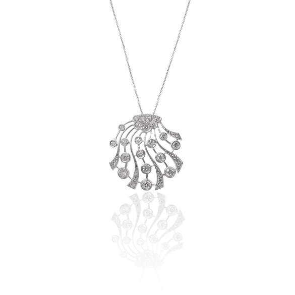 Üstün kesim, renk, berraklık ve parlaklıkta sınıfının en iyisi pırlantalardan üretilen kıvrımlı hatlara sahip kolye. Orta sıralarda yer alan yuvarlak  kesim büyük boy pırlantalar, onlara eşlik eden ufak boydaki pırlantalarla birlikte ahenkli bir uyum sağlar. 17" zincir üzerinde yer alan kolye özel günlerinizde şık bir eşlikçidir.
